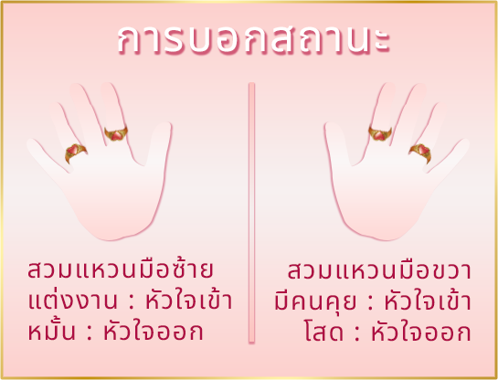 • แต่งงานแล้ว (Married): สวมแหวนที่ มือซ้าย โดยหันปลายแหลมของหัวใจ เข้าหาตัว (ความรักแนบแน่นนิรันดร์)
