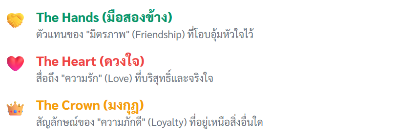 1. มือสองข้าง (The Hands): โอบอุ้มหัวใจไว้ตรงกลาง เป็นตัวแทนของ “มิตรภาพ” (Friendship)